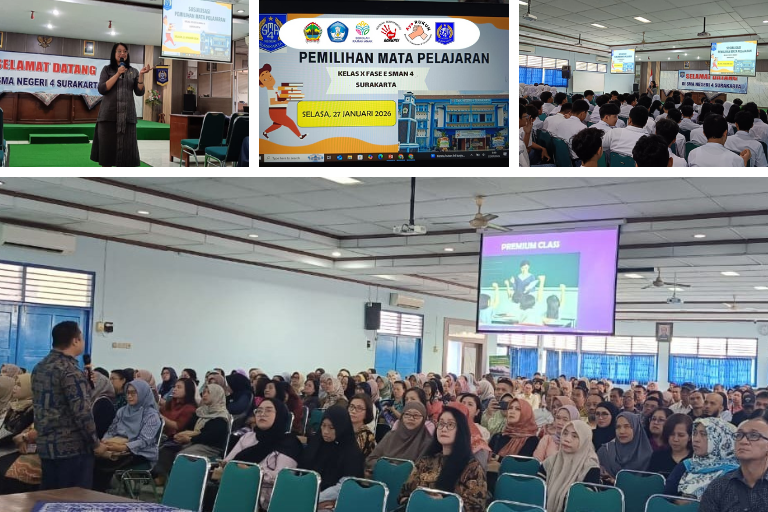 SMAN 4 Surakarta menyelenggarakan kegiatan Sosialisasi Pemilihan Mata Pelajaran (Mapel) Pilihan untuk Kelas X Fase E sebagai bagian dari persiapan peserta didik dalam memasuki Fase F (kelas XI). Kegiatan ini dilaksanakan di Aula SMAN 4 Surakarta dan terbagi menjadi dua Selengkapnya